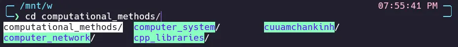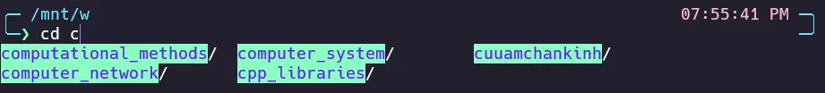 Cũng có thể gõ vài ký tự rồi bấm tab, terminal sẽ gợi ý các thư mục có tên bắt đầu bằng các ký tự đã nhập.