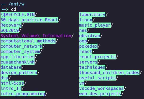 Khi bấm tab trong lúc nhập lệnh cd tại một thư mục bất kỳ, terminal sẽ gợi ý các thư mục con có trong thư mục đó.