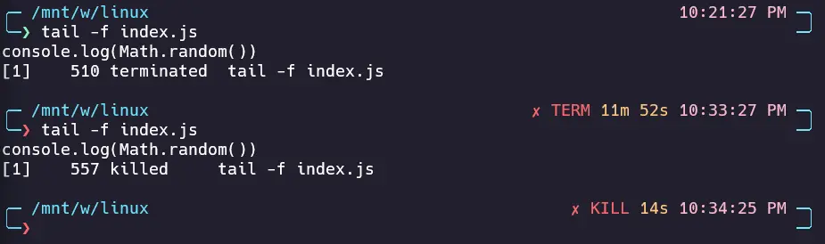 - SIGTERM(15): yêu cầu chương trình cần phải tắt đi. Có một delay nhất định để phía chương trình kịp lưu các dữ liệu cần thiết. Đây là tín hiệu mặc định.