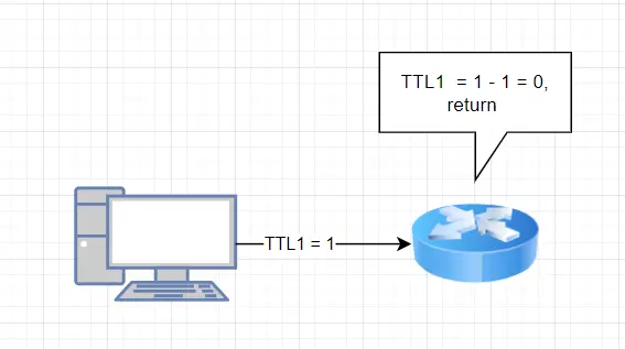 Đầu tiên thì bên gửi sẽ gửi gói tin số 1 có TTL1 = 1 đến first hop router. Tại đây, TTL sẽ bị trừ đi một giá trị thành 0. Khi router thấy TTL thành 0 thì sẽ hủy gói tin ICMP nhận được và trả về cho host nguồn gói tin ICMP echo reply. Gói tin ICMP echo reply này sẽ giúp host nguồn xác định được router đầu tiên trong dãy các router đến host đích.