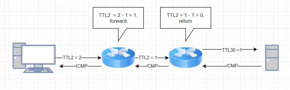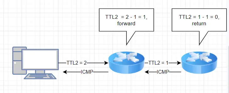 Khi gói tin có TTL bằng 0 thì router hoặc host sẽ hủy gói tin ICMP nhận được và sẽ gửi lại cho bên gửi một gói tin có tên là ICMP echo reply. Chú ý là có thể có một số router và một số host được cấu hình để không gửi lại gói tin ICMP echo reply.