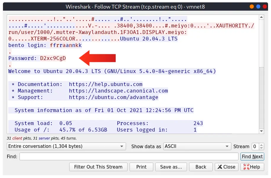 Chữ màu đỏ là dữ liệu của server hiển thị trên terminal và chữ màu xanh là dữ liệu mà ta nhập vào. Có thể thấy, khi nhập password, dữ liệu không được mã hóa và có thể bị bắt bởi các ứng dụng bắt gói tin chẳng hạn như Wireshark.