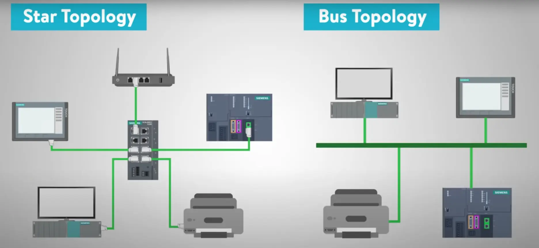 Có hai loại đồ hình mạng (network topology) phổ biến là: star và bus. Bus có thể gây xung đột và cần sử dụng các giao thức kiểm soát đa kết nối (Multiple Access Control Protocols). Ngày nay thì người ta sử dụng star nhiều hơn bằng cách kết nối các thiết bị thông qua các switch.