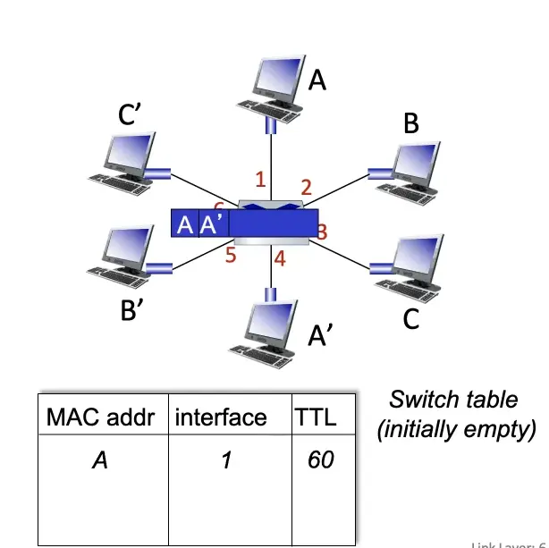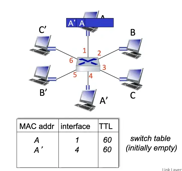 Sau khi có được thông tin của A’ trong switch table, switch sẽ chuyển gói tin ra cổng số 4 để đến được A’ (bước “forward” trong nguyên lý hoạt động của switch).