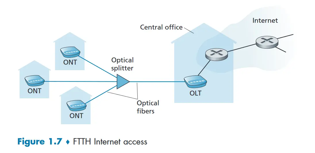 Với PON, mỗi căn hộ có một đầu kết mạng quang (optical network terminator, viết tắt là ONT), kết nối với một bộ tách quang (optical splitter). Bộ tách này gom chung các đường truyền của các hộ gia đình thành một thiết bị đầu kết đường quang (optical line terminator, viết tắt là Old) đặt tại ISP. Old là thiết bị chuyển đổi qua lại giữa tín hiệu quang và tín hiệu điện tử để kết nối với internet.