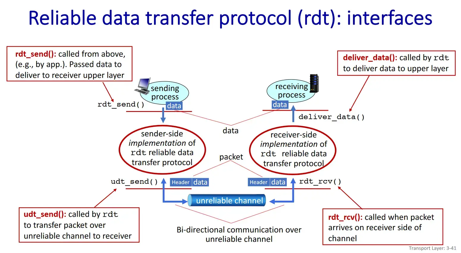 Ta sẽ phát triển dần dần giao thức truyền tin tin cậy với nhiều trường hợp khác nhau (rdt1.0, rdt2.0, rdt3.0 và pipeline). Các giao thức này sẽ nằm xen giữa quá trình gửi tin giữa hai kênh truyền: tin cậy và không tin cậy.