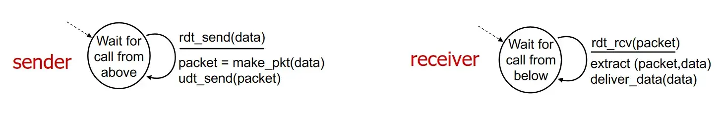Ở phiên bản này, bên gửi sẽ lắng nghe các lời gọi gửi gói tin từ tầng ứng dụng (rdt_send(data)) để tạo ra gói tin (make_pkt(data)) và truyền cho kênh truyền ở tầng bên dưới (udt_send(packet)). Bên nhận khi nhận được các gói tin từ kênh truyền (rdt_rcv(packet)) sẽ trích xuất dữ liệu (extract(packet, data)) và chuyển lên tầng trên (deliver_data(data)).