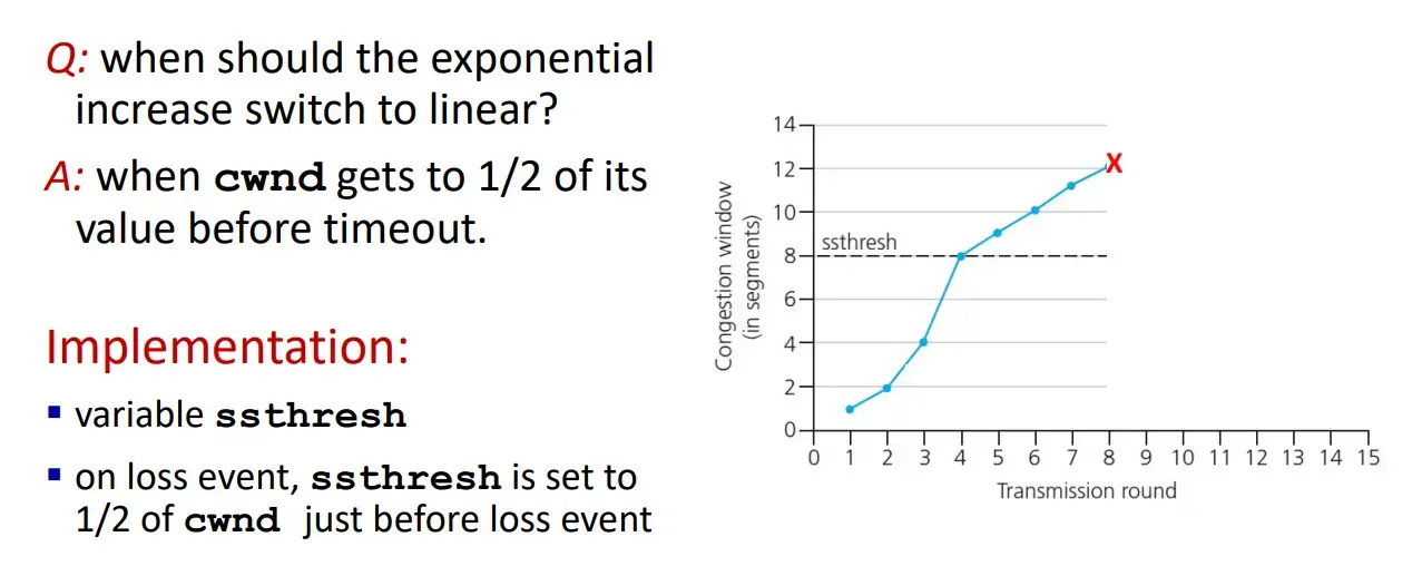 Có hai giai đoạn là giai đoạn slow start và giai đoạn congestion avoidance. Với slow start, tốc độ truyền tin (ta gọi là congestion window - cửa sổ tắc nghẽn) được tăng gấp đôi nếu không xảy ra mất gói.