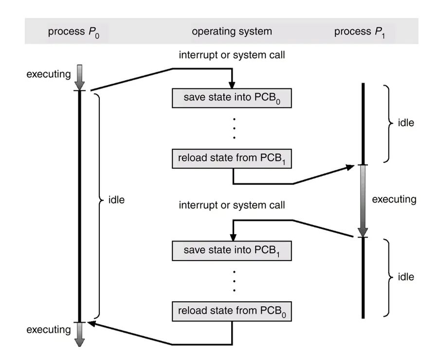 Context switch (chuyển đổi ngữ cảnh): là quá trình lưu và khôi phục trạng thái của một tiến trình nào đó để nó có thể tiếp tục được thực hiện sau khi bị tạm dừng. Các trạng thái được lưu ở trong các thanh ghi của PCB.