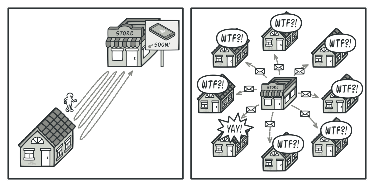 Một giải pháp khác là store sẽ gửi thông báo (spam) đến cho tất cả các customer khi có hàng. Tuy nhiên, chỉ những customer quan tâm đến sản phẩm mới không thấy khó chịu bởi thông báo này. Khi đó, store chỉ làm vừa lòng một vài customer nhưng lại gây mất thiện cảm với các customer khác.