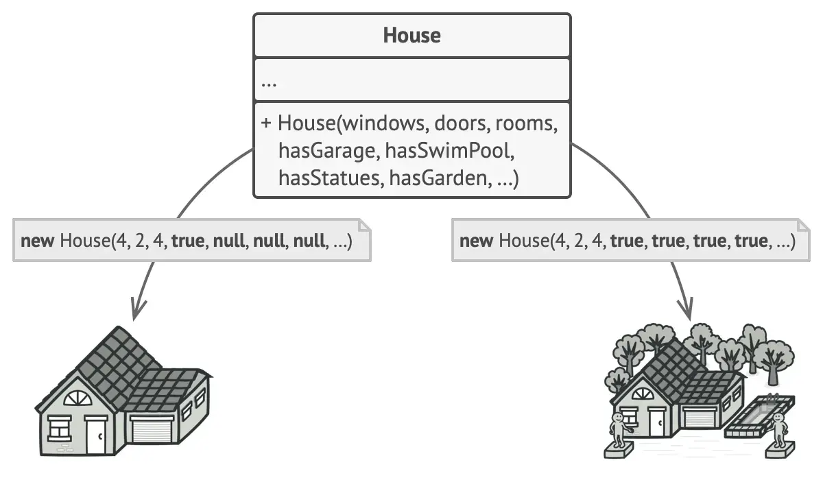 };Có thể thấy, constructor của căn nhà chứa rất nhiều tham số và có thể phình to ra hơn nữa trong tương lai. Trong trường hợp ta muốn xây dựng một căn nhà có cả cây và tượng trang trí, ta cần phải tạo ra một constructor khác có nhiều tham số hơn: