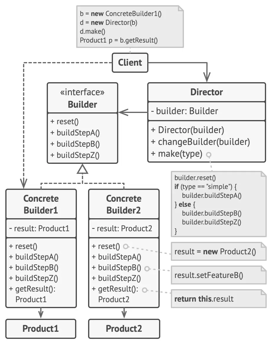 - Builder: là một interface khai báo những bước cần thiết để tạo ra object.