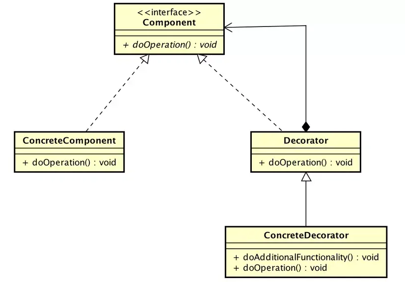 - Concrete Component: một implementation của component mà có bản chất là một đối tượng cần thêm chức năng.