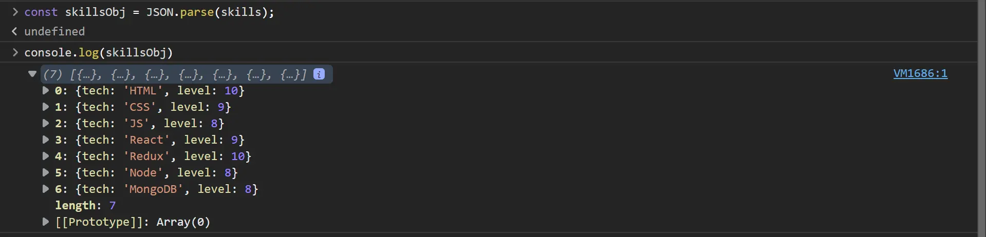 Như đã thấy, giá trị của skills là một mảng các object, có thể dùng phương thức parse để tách thành object