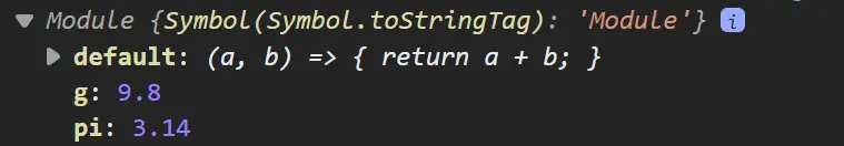 import * as math from "./app.js"Bằng cách này, ta có thể lấy tất cả các export cho vào math. Biến math này là một object thuộc lớp đối tượng Module.