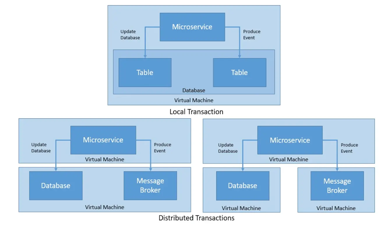 - Distributed transaction: a transaction can involve multiple independent resources like databases, message queues, or web services. These resources can execute on the same virtual machine, on different virtual machines in the same physical machine, or different physical machines altogether.
