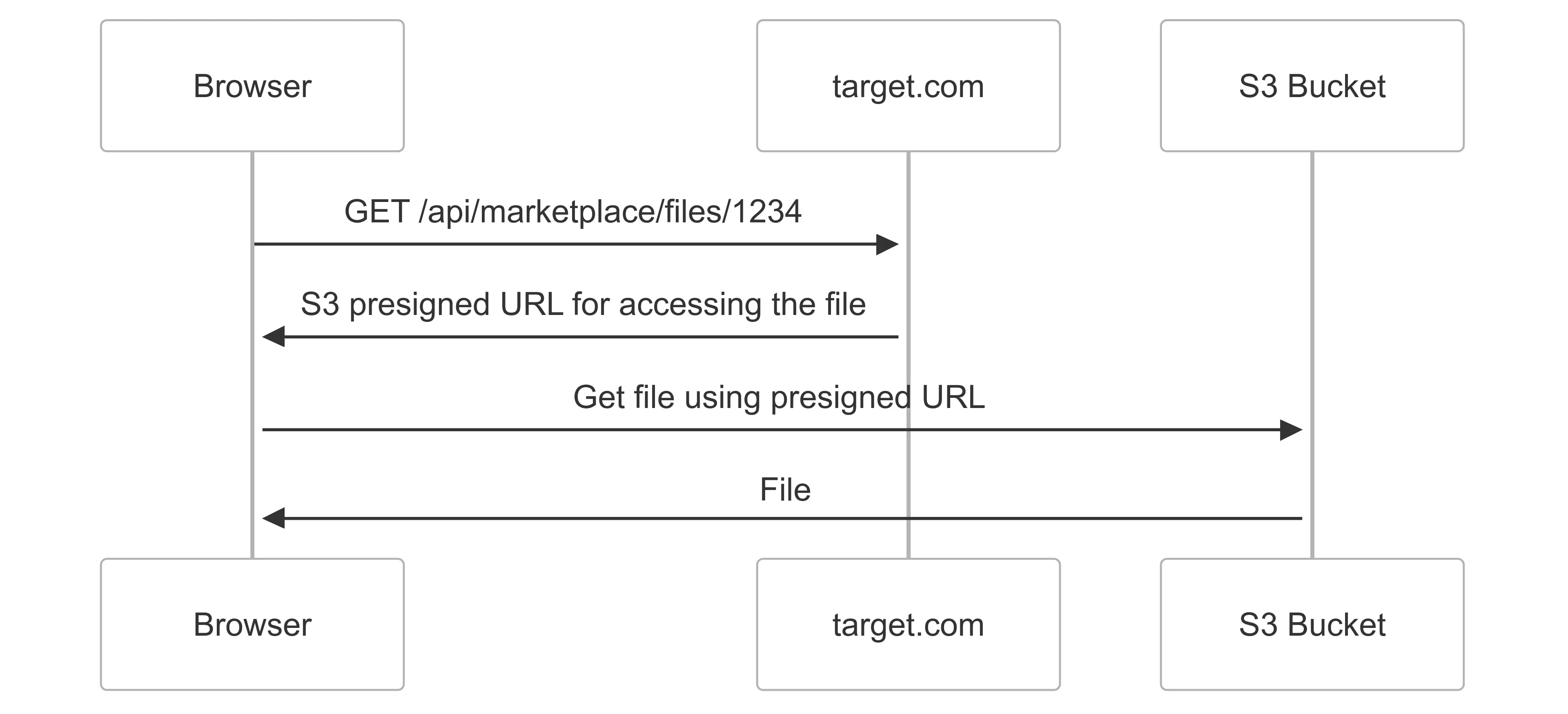 API lấy file tại /api/marketplace/files/[file_number] sẽ trả về một S3 pre-signed URL1 cho từng file được upload để truy cập. Tuy nhiên, chúng ta không thể traverse đến domain của S3 sử dụng CSPT.