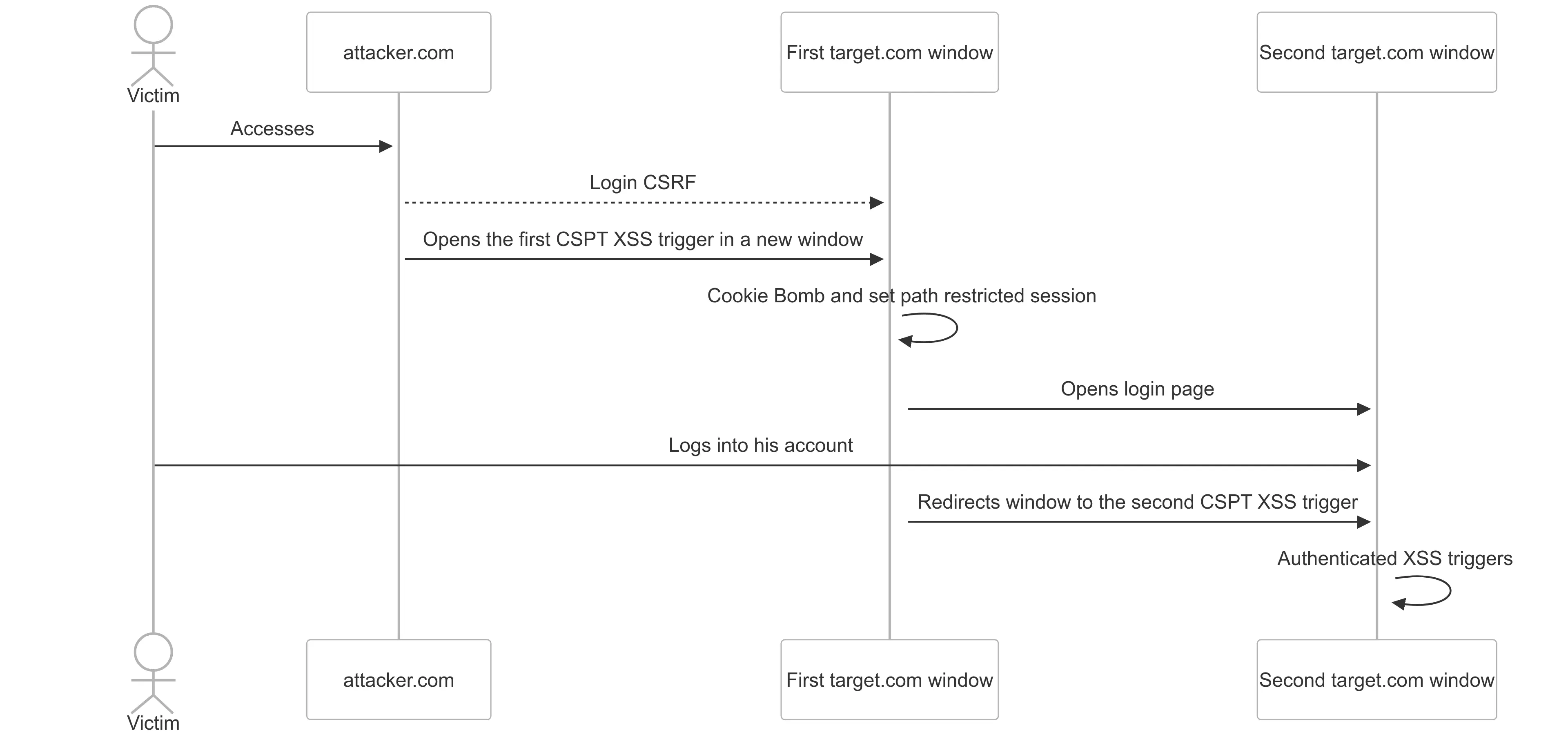 Chuỗi tấn công cuối cùng cần 2 lần thực thi XSS. Lần đầu tiên để thực hiện cookie bombing victim và set Session cookie cho path /api/marketplace/files. XSS đầu tiên này cũng prompt user để họ log in vào tài khoản của họ một cách thủ công bằng cách mở một cửa sổ mới đến trang log in. Kể cả khi victim log in vào tài khoản của họ thì browser vẫn sẽ dùng attacker cookie cho path /api/marketplace/files.