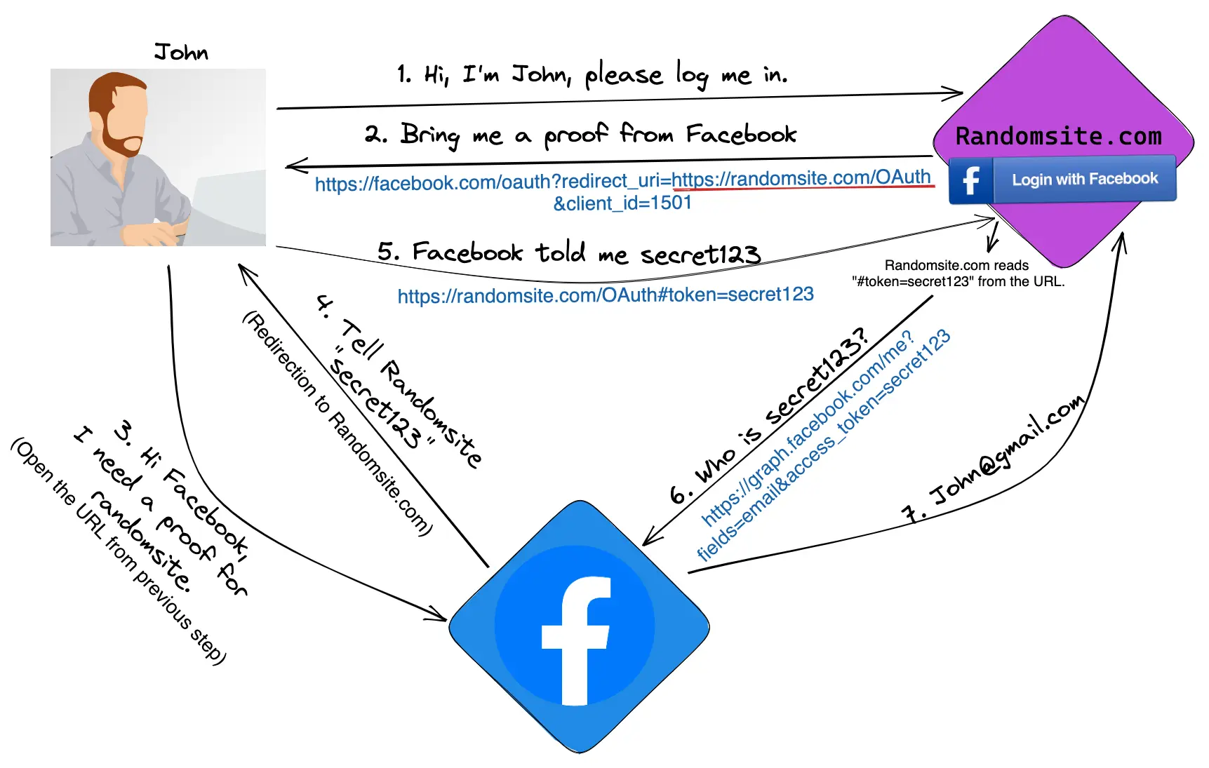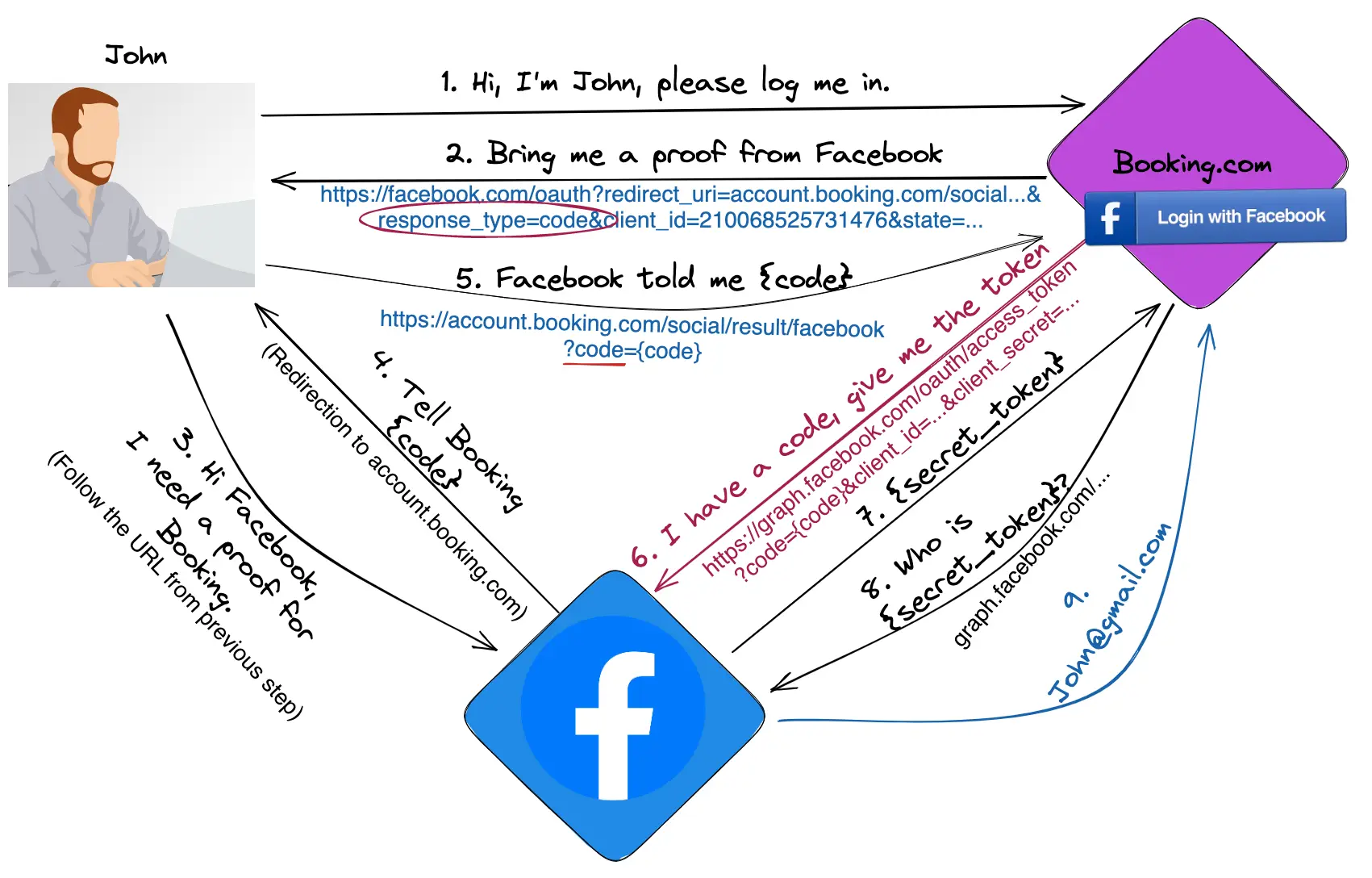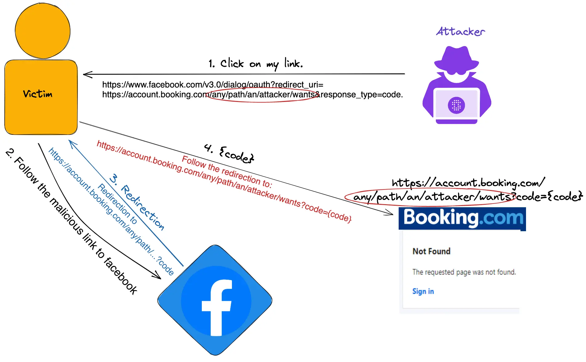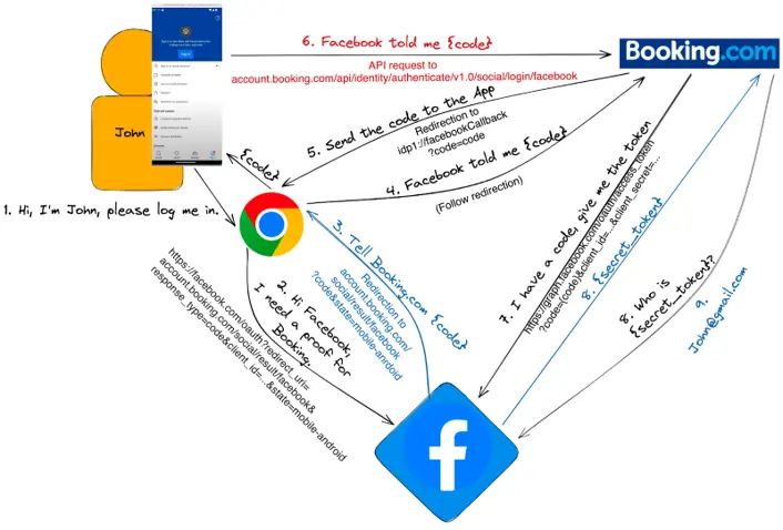 Có thể thấy, từ bước 3 đến bước 6, giá trị code được truyền từ Facebook đến Chrome, sau đó đến Booking.com, về lại application rồi qua Booking.com một lần nữa. Ở bước 6, application gửi code thông qua một POST request: