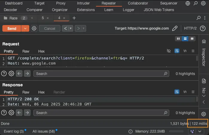 Nếu chúng ta gửi 2 request trong cửa sổ thời gian 1ms, 2 lần gọi hàm Random liên tiếp sẽ sử dụng cùng seed và do đó mà có cùng kết quả đầu ra. Để tấn công, ta có thể gửi 2 request để reset email với của victim và của attacker sử dụng kỹ thuật Single Packet Attack1 (là kỹ thuật đặt nhiều gói tin HTTP 2.0 vào một gói tin TCP), vốn được hỗ trợ bởi Burp Suite.