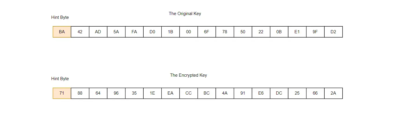 }Có thể thấy, byte đầu tiên của plaintext key chính là hint byte.