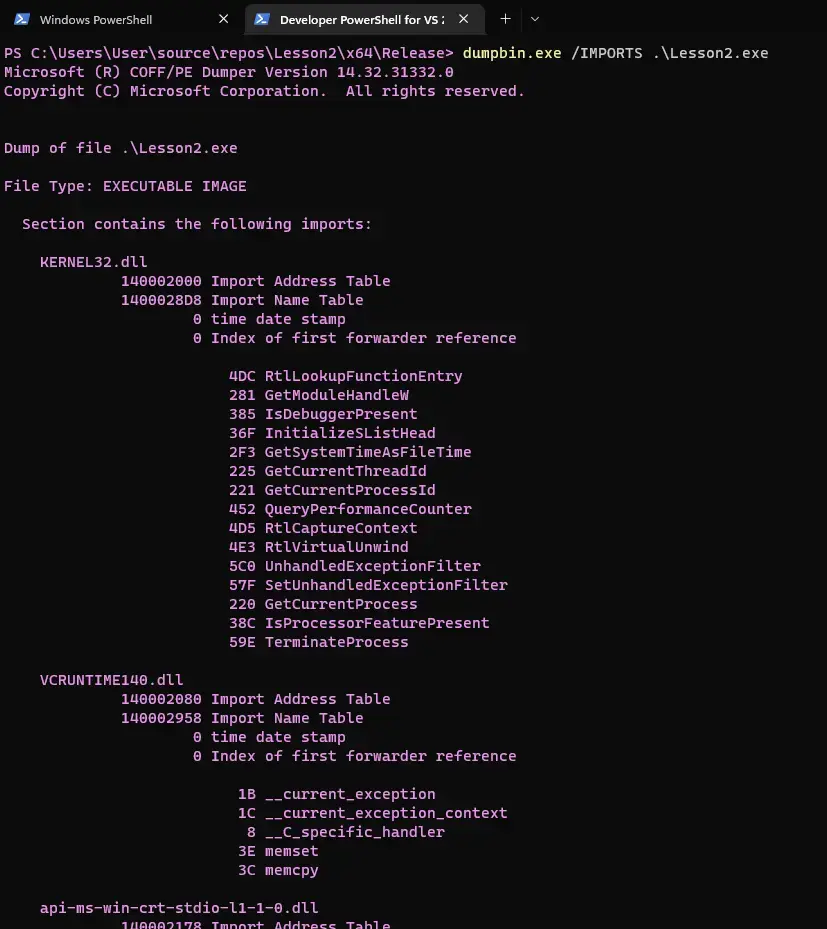 Hình bên dưới minh họa cho việc sử dụng công cụ dumpbin.exe để kiểm tra IAT của một file nhị phân: