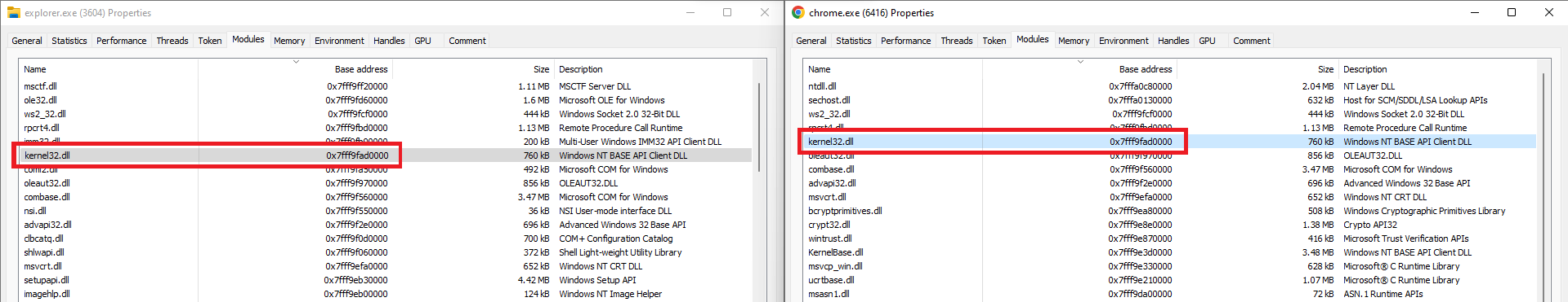 Hệ điều hành Windows sử dụng cùng một địa chỉ vùng nhớ cho một vài DLL hệ thống và có thể được sử dụng bởi tất cả các tiến trình có trên máy. Điều này là để tối ưu hóa bộ nhớ và cải thiện hiệu năng. Hình bên dưới minh họa cho việc kernel32.dll được nạp lên tại cùng một địa chỉ vùng nhớ (0x7fff9fad0000) ở nhiều tiến trình khác nhau.