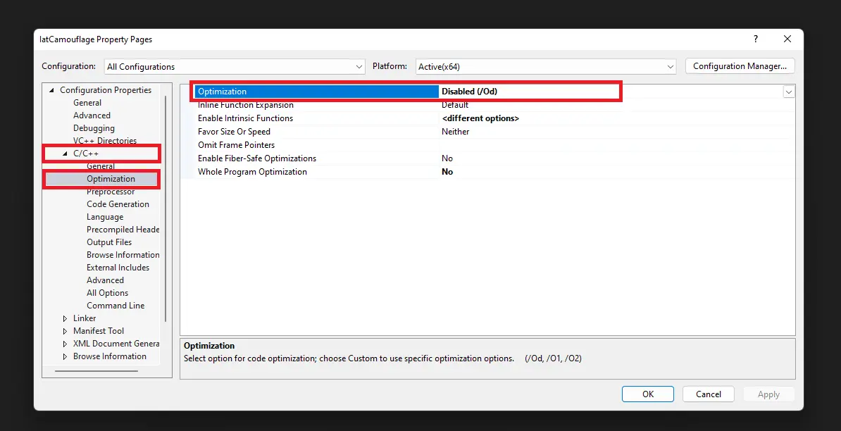 Để disable, ta chỉ cần chỉnh option Optimization của Visual Studio thành “Disabled (/Od)”