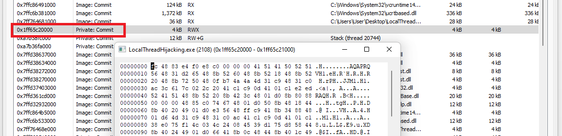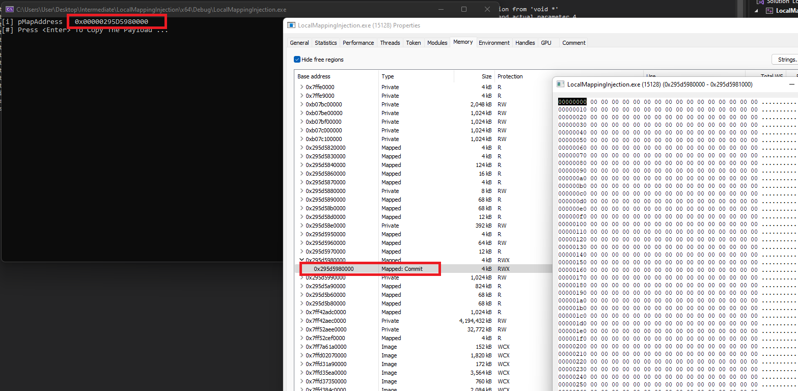 MapViewOfFileđể ánh xạ file mapping object vào vùng nhớ của tiến trình hiện tại. - Sao chép payload vào vùng nhớ ánh xạ của tiến trình hiện tại.