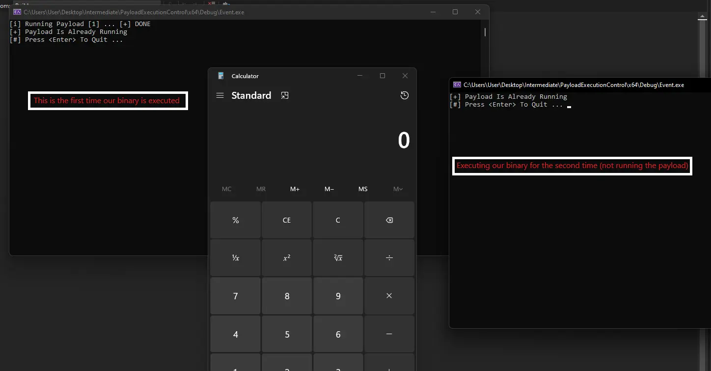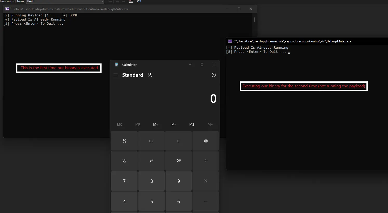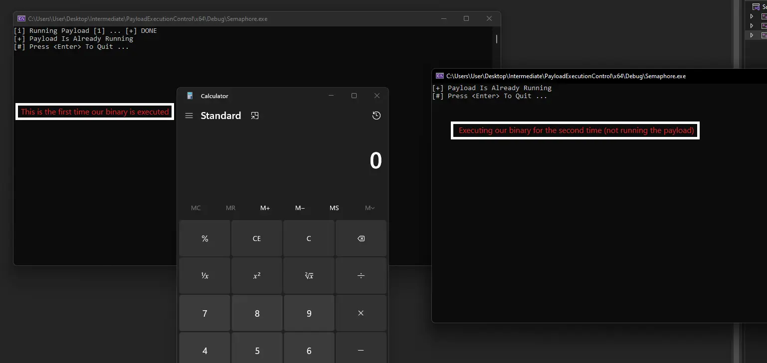 Để kiểm soát quá trình thực thi, mỗi khi payload được chạy, ta sẽ tạo một named semaphore (semaphore có tên). Nếu đây là lần đầu tiên malware được thực thi, named semaphore sẽ được tạo và payload sẽ tiếp tục chạy. Ngược lại, nếu một tiến trình khác của malware khởi chạy, semaphore sẽ không được tạo do đã tồn tại một semaphore cùng tên. Điều này cho thấy payload đang hoạt động và việc thực thi sẽ được ngăn chặn nhằm tránh sự trùng lặp.