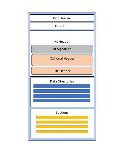 Có thể thấy, định dạng PE bao gồm các header, các data directory và các section.
