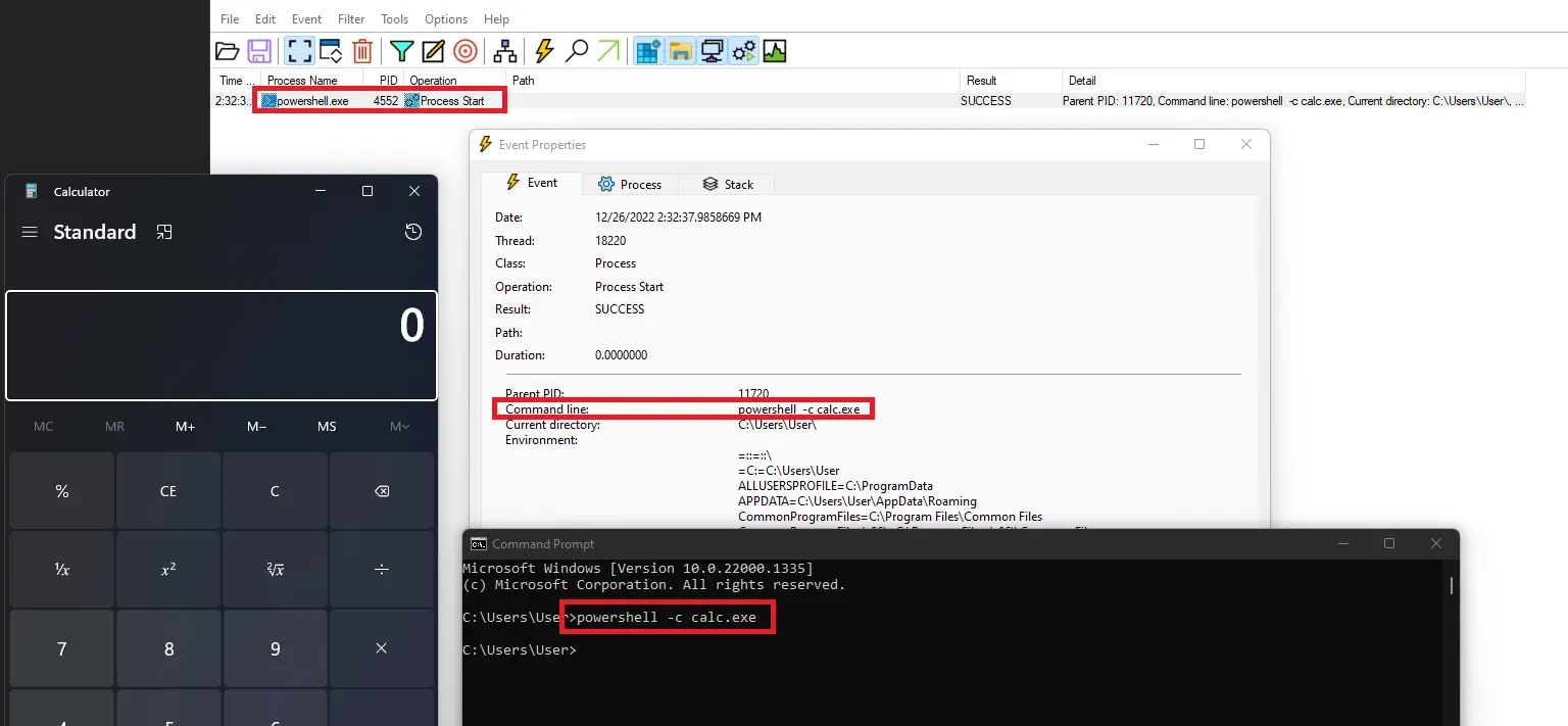 Câu lệnh dòng lệnh powershell.exe Totally Legit Argument sẽ bị ghi lại bởi Procmon trong khi powershell.exe -c calc.exe sẽ được thực thi: