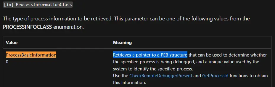 // Getting the address of the NtQueryInformationProcess functionfnNtQueryInformationProcess pNtQueryInformationProcess = (fnNtQueryInformationProcess)GetProcAddress(GetModuleHandleW(L"NTDLL"), "NtQueryInformationProcess");if (pNtQueryInformationProcess == NULL) return FALSE;