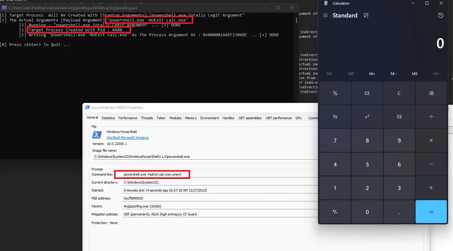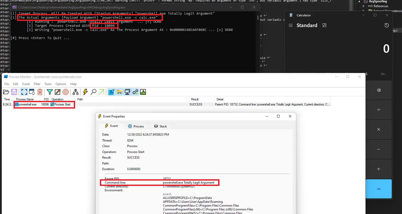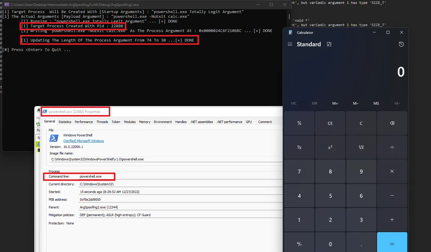 Để làm giả các đối số dòng lệnh cho một tiến trình mới tạo, ta sẽ cần tạo ra một tiến trình ở trạng thái trì hoãn (suspended) và truyền vào các đối số tùy ý mà không bị xem là đáng ngờ. Trước khi resume tiến trình, ta sẽ thay đổi giá trị của PEB->ProcessParameters.CommandLine.Buffer thành đối số mà ta muốn thực thi. Khi đó, các dịch vụ ghi nhật ký sẽ chỉ ghi lại được các đối số tùy ý trước đó.