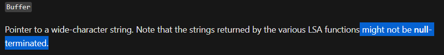 Các công cụ chẳng hạn như Process Hacker đọc CommandLine.Buffer dựa trên chiều dài được chỉ định bởi CommandLine.Length thay vì đọc cho đến khi gặp ký tự kết thúc chuỗi bởi vì Microsoft khẳng định trong tài liệu của họ rằng thành phần UNICODE.Buffer không nên kết thúc bằng ký tự kết thúc chuỗi.