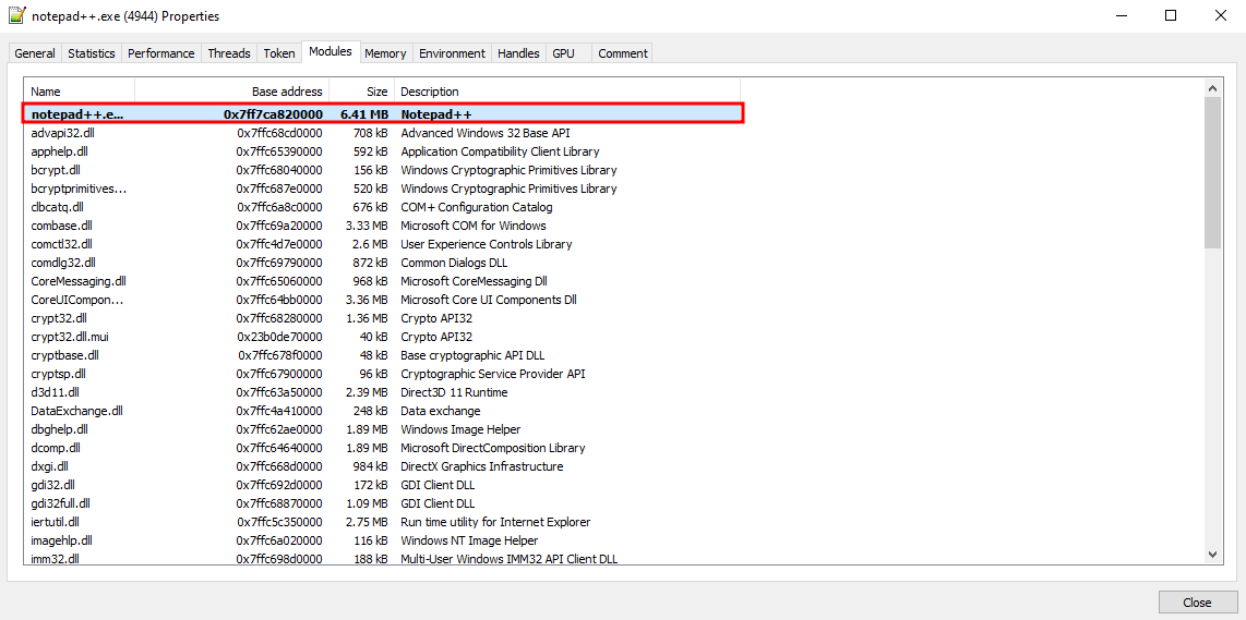 OpenProcess: được dùng để mở handle đến tiến trình với quyền truy cập làPROCESS_QUERY_INFORMATIONvàPROCESS_VM_READ.EnumProcessModules: enum tất cả các module có trong tiến trình. Cần thiết cho bước 3.GetModuleBaseName: xác định tên của tiến trình từ danh sách các module có được ở bước 2.
