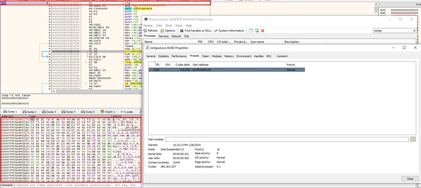 Ngoài ra, thread entry của tiến trình sẽ trông vô hại nhưng RIP của nó lại trỏ đến shellcode: