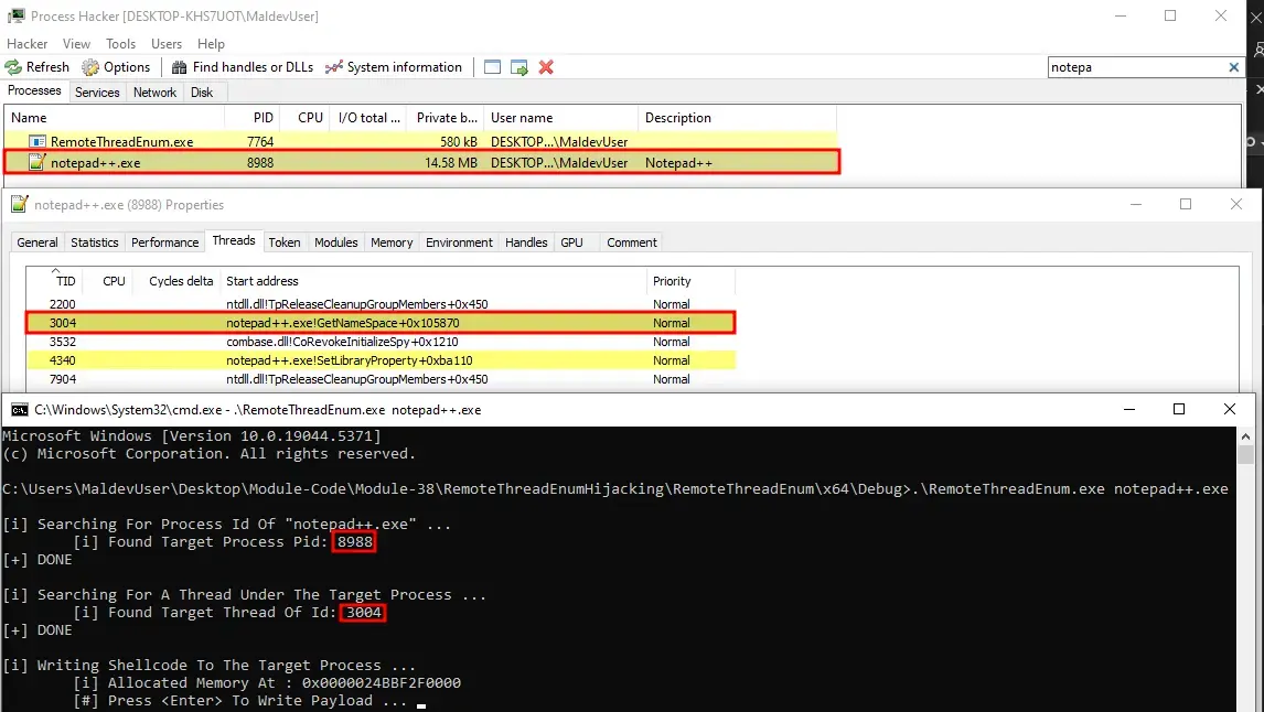 Hình bên dưới minh họa cho việc ta đã tìm được một thread ở trong tiến trình notepad++.exe: