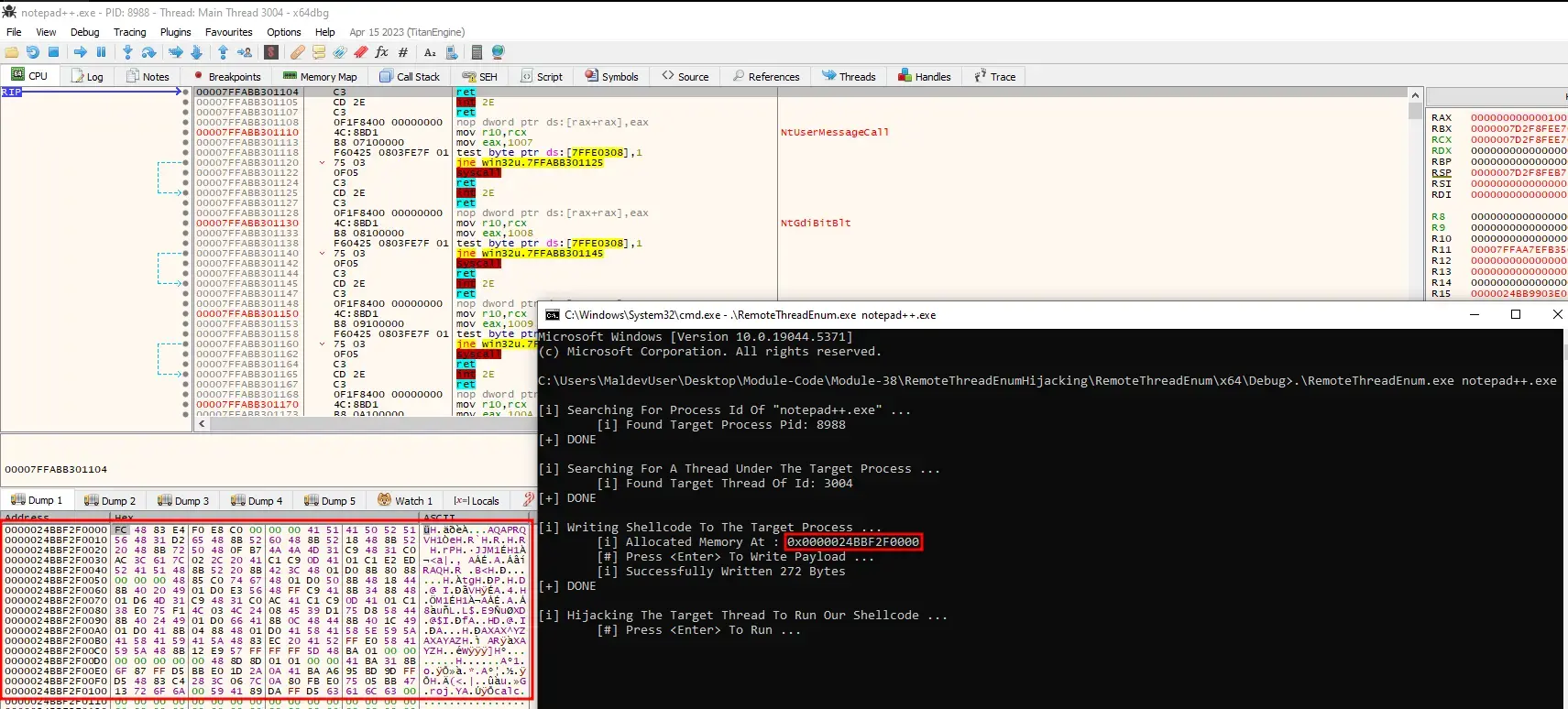 }Có thể thấy, việc hijack remote thread cũng tương tự với việc hijack local thread: chúng ta sẽ lấy ra gán RIP của thread context là địa chỉ của shellcode rồi resume thread.