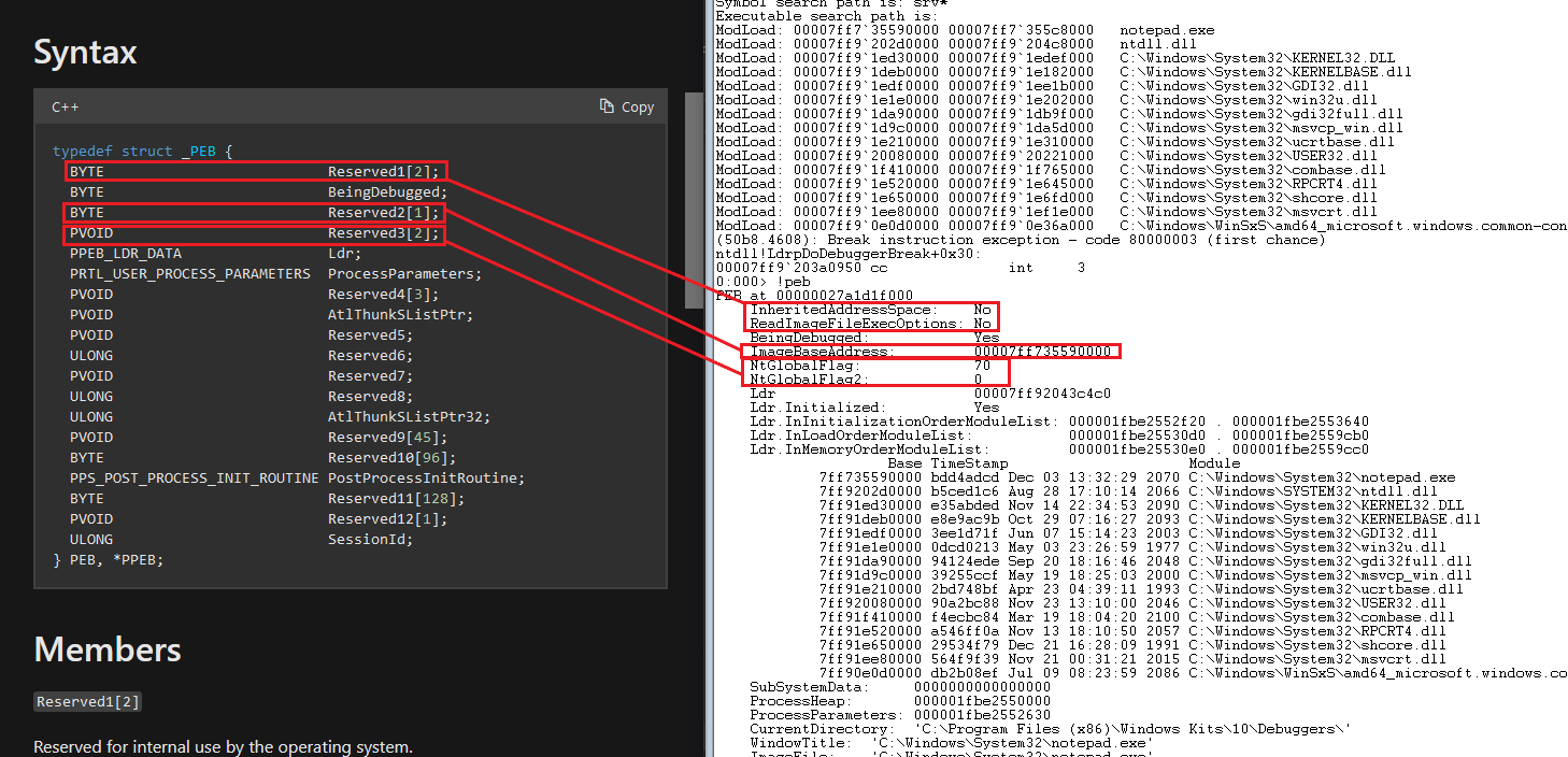 Có một cách để xác định các thành phần Reserved là sử dụng lệnh !peb ở trong WinDbg: