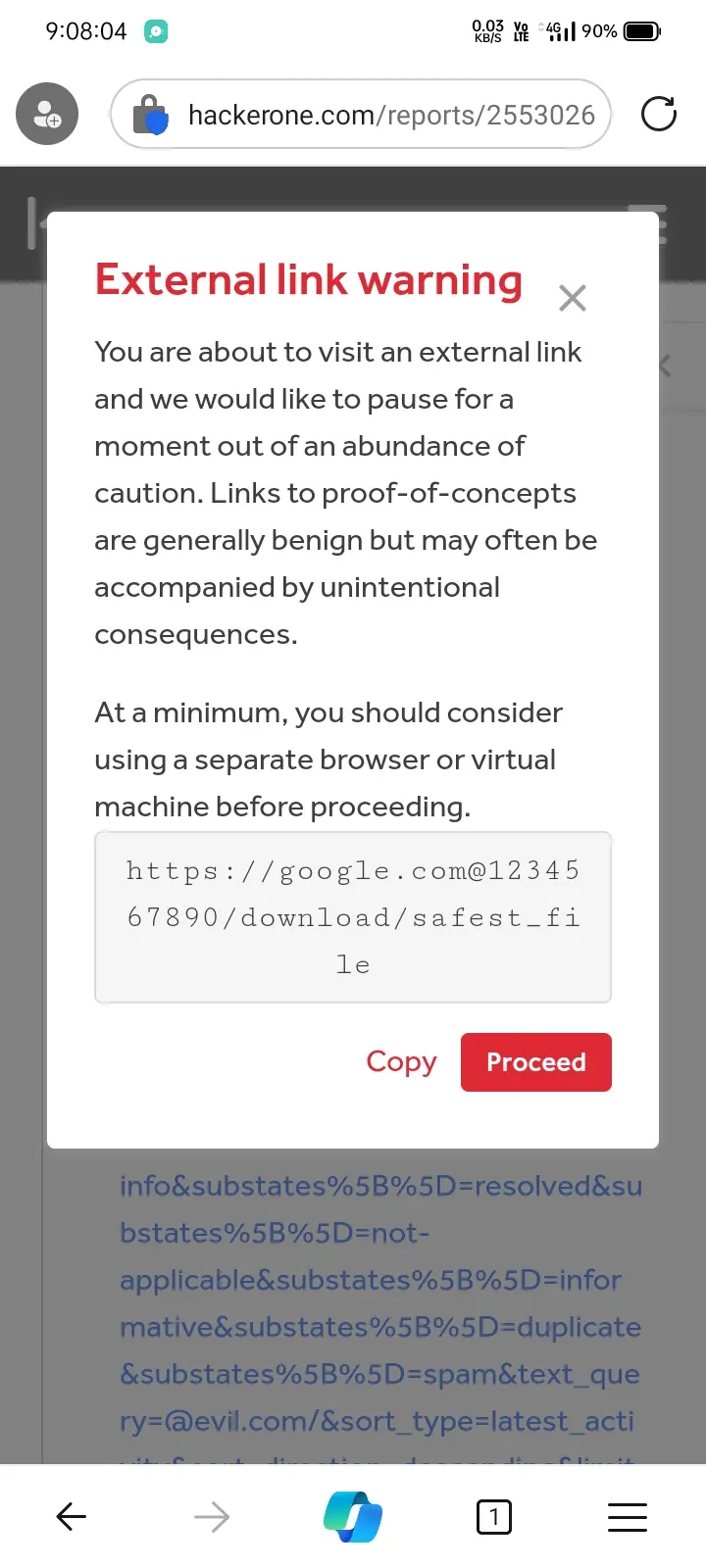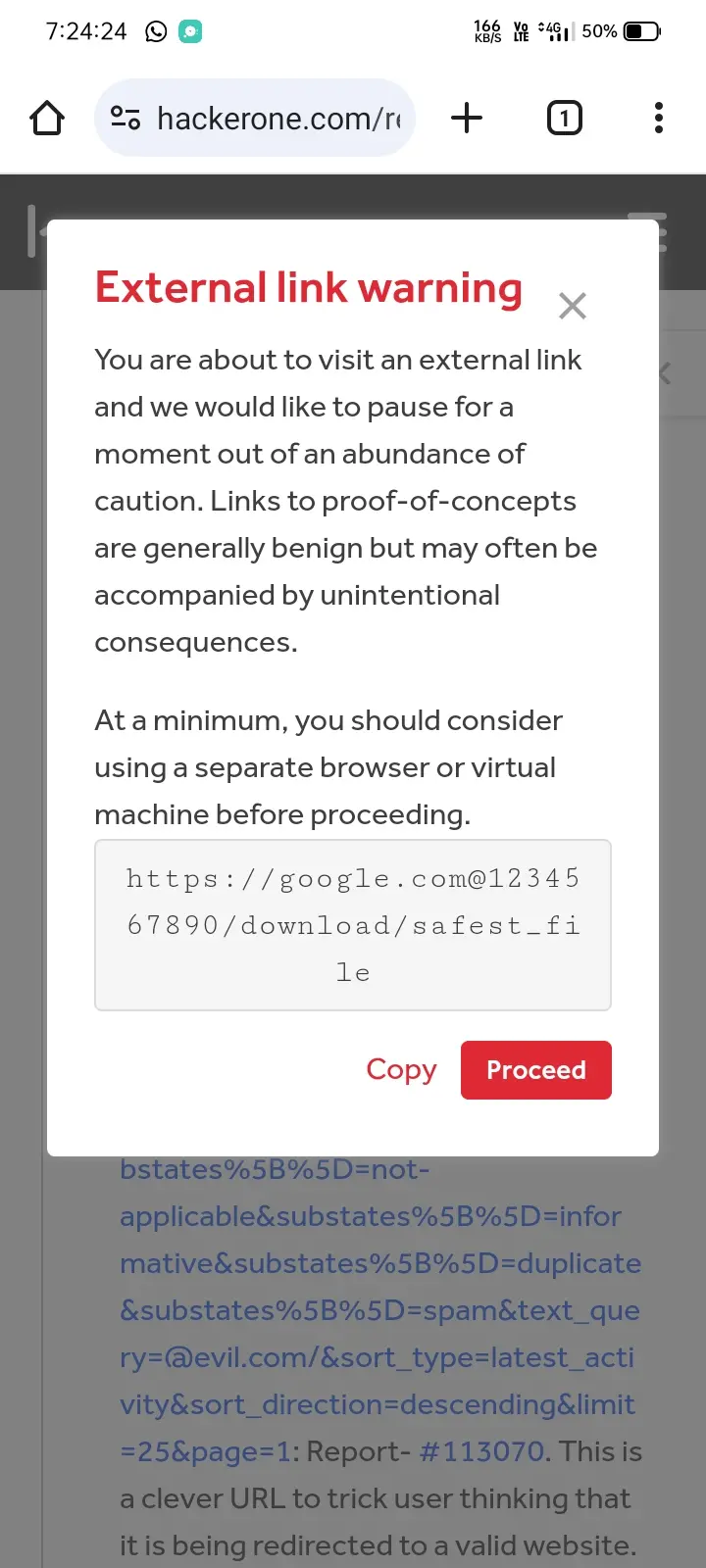 Researcher nhận thấy rằng chức năng highlight URL trong thông báo truy cập vào external website của HackerOne không hoạt động trên trình duyệt Edge và Chrome của mobile. Attacker có thể dẫn dụ họ để bấm vào các malicious link mà trông như legit links chẳng hạn như: