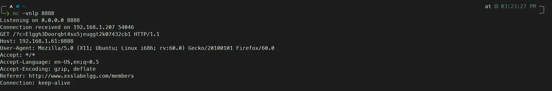 nc -vnlp 8888Đăng nhập vào Admin rồi xem sách các thành viên, ta sẽ thu được một request có chứa cookie ở phía Netcat server như sau: