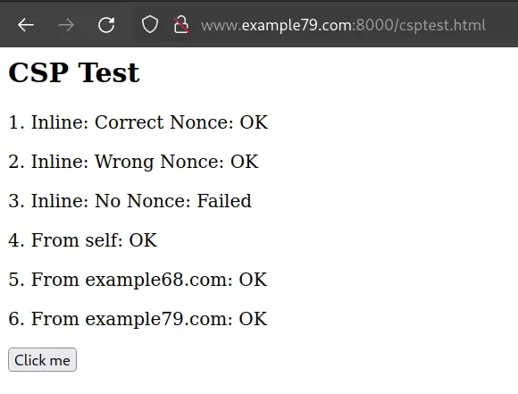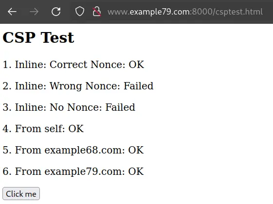 Content-Security-Policy: default-src 'self';script-src 'self' *.example68.com:8000 *.example79.com:8000 'nonce-1rA2345' 'nonce-2rB3333'Khi đó, dòng 1, 2, 4, 5 và 6 sẽ có giá trị là OK: