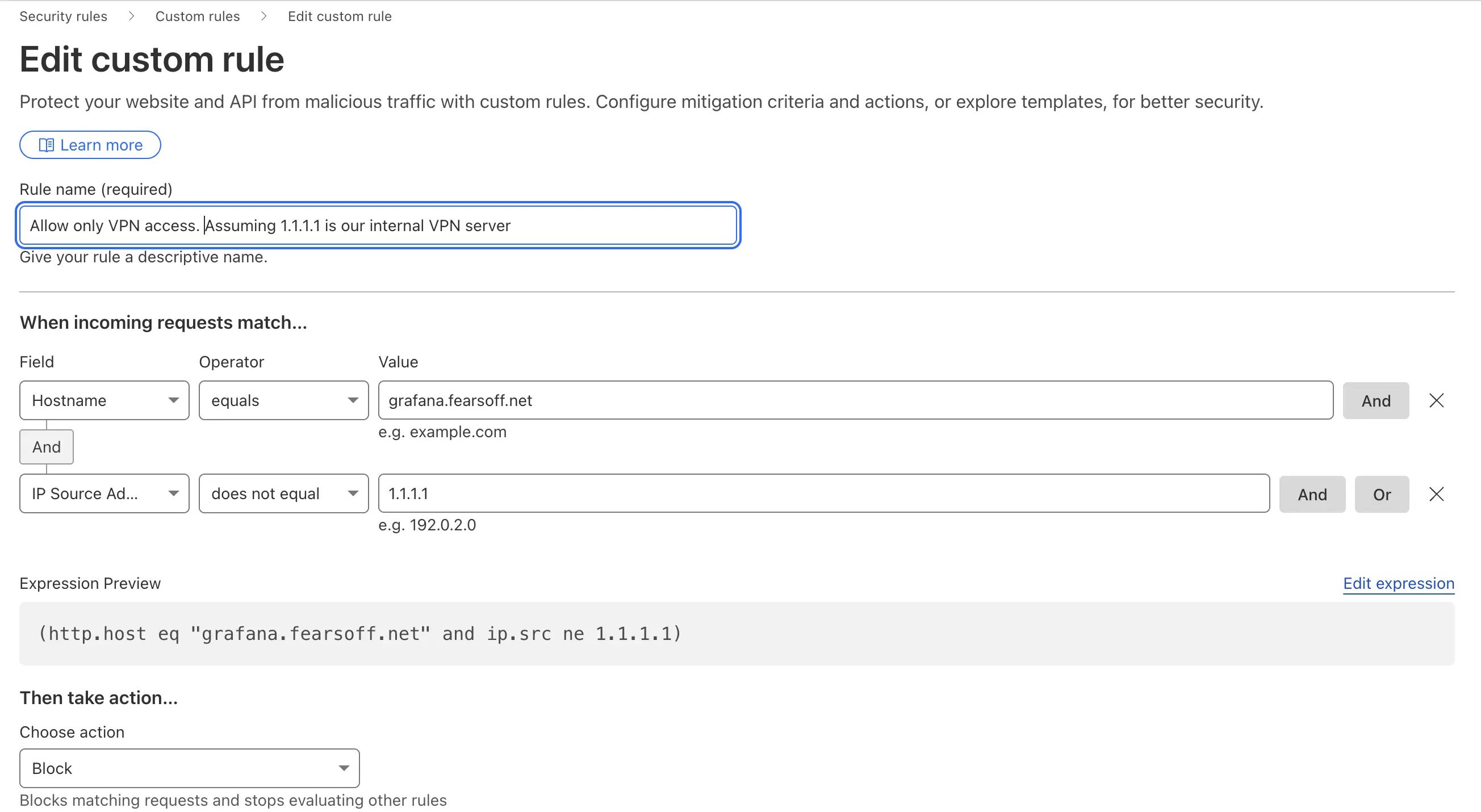 (http.host eq "grafana.fearsoff.net" and ip.src ne 1.1.1.1)Rule này quy định rằng request gửi đến phải có Host header và từ internal VPN 1.1.1.1 của CloudFlare.